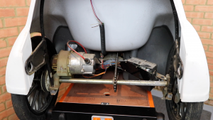 Having removed the boot, I was able to inspect the external condition of the motor, the pedal drive chain and the ‘control box’. These all look OK, apart from the electrical control box, which has had part of its cover replaced with a loose piece of plastic. A genuine part will need to be found, and as stated earlier this could be a challenge. The chassis (Lotus designed!) is in reasonable condition with a few very small spots of rust. I’d like to get a closer look at the chassis, which means a complete strip down which will be undertaken in the next video.
